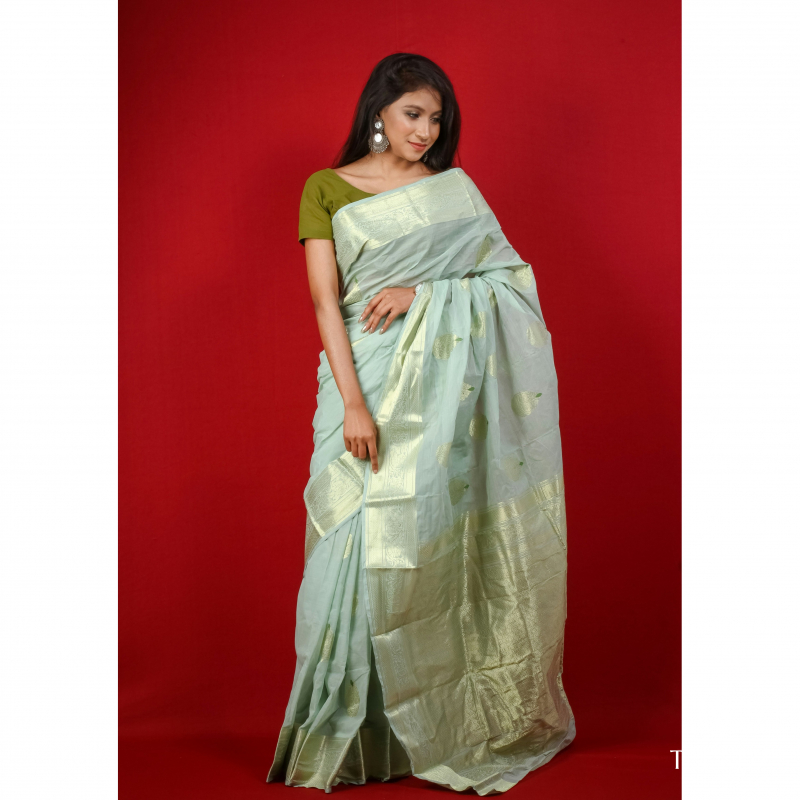 Step into timeless grace with the Mint Glow Banarasi Silk Saree, a blend of tradition and sophistication. This exquisite saree, woven in a soft pastel mint shade, features delicate golden zari motifs and a rich border, reflecting the elegance of classic Banarasi craftsmanship. The lightweight silk fabric ensures effortless draping, making it a perfect choice for festive celebrations, weddings, and special occasions. Pair it with statement jewelry and a complementing blouse for a royal and ethereal look.